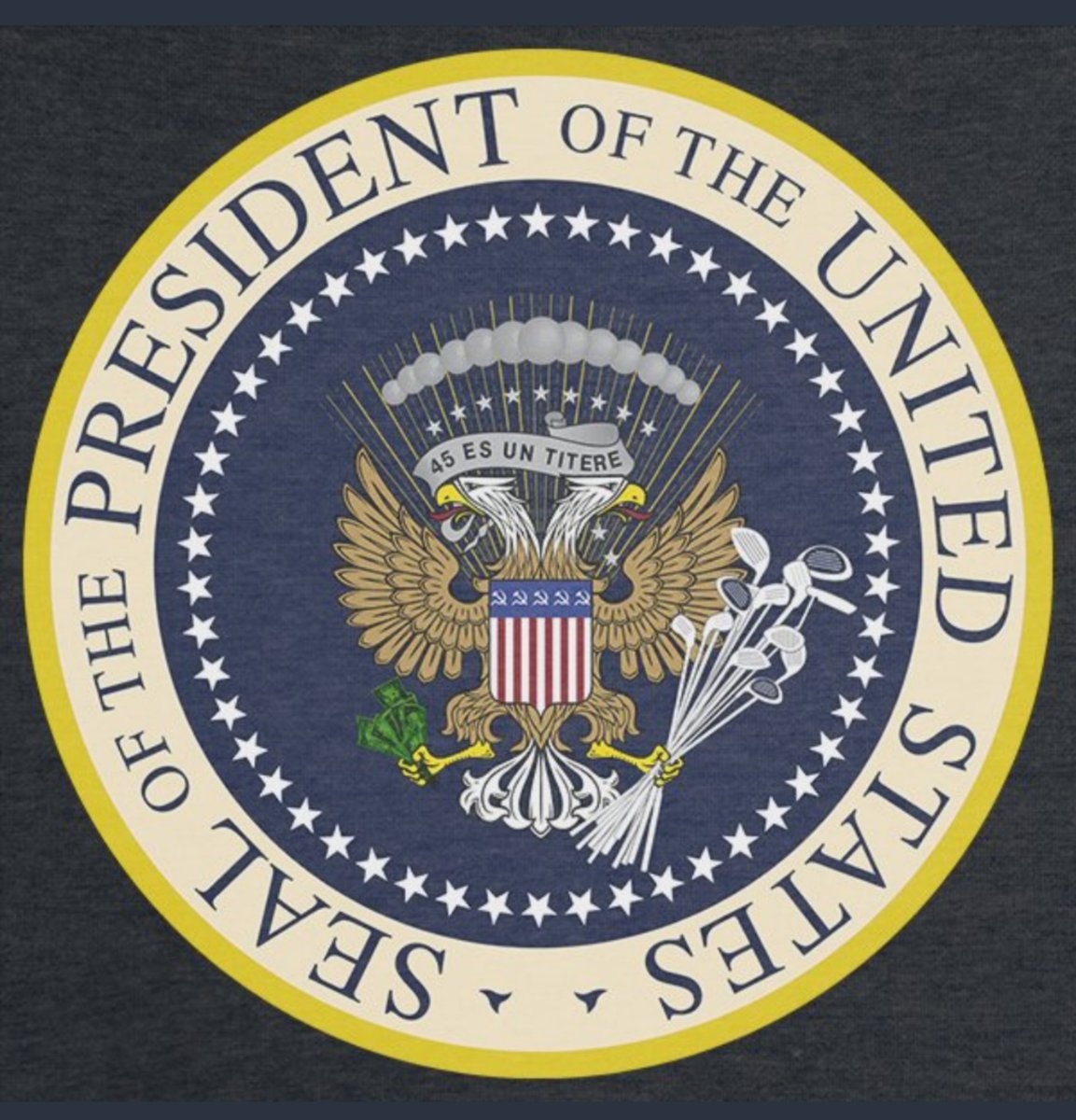 Orol drzi v lavom pazure dolare a napis na prerobenom znaku je spanielsky 45 es un titere, znamena to 45 [prezident] je babka. Tento znak sa vraj predava online