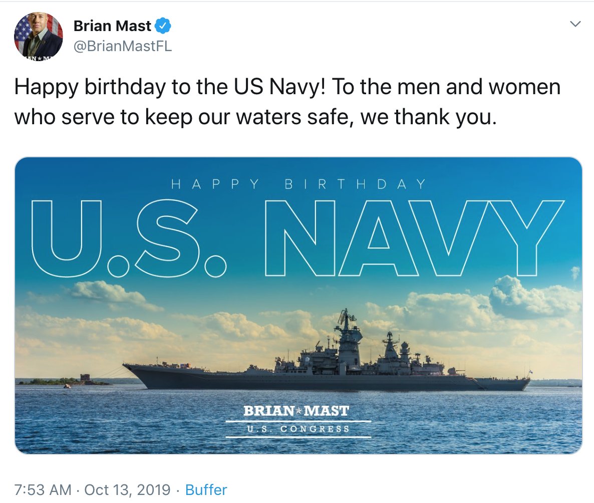 Americký kongresman a veterán afghánské války Bryan Must blahopřál americkým námořníkům k výročí založení válečného loďstva obrázkem s ruským jaderným křižníkem Petr Veliký. :dobre: