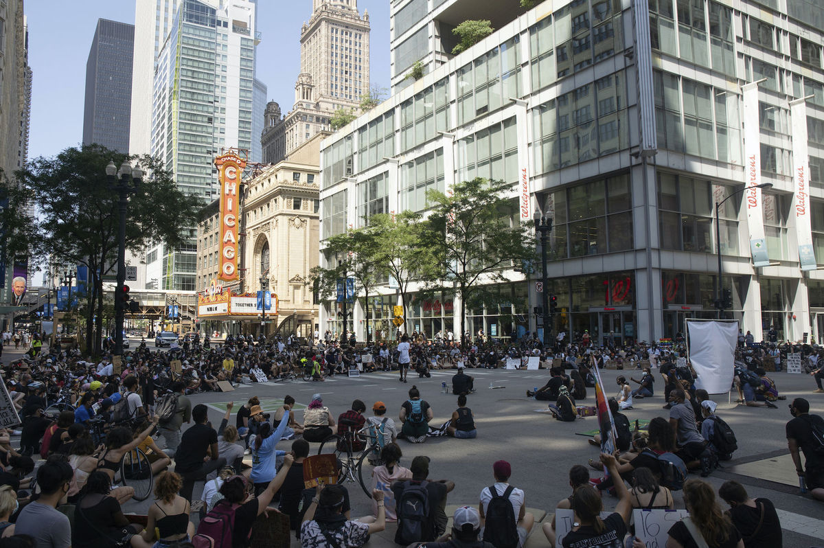 Stovky ľudí potichu sedia a kľačia takmer deväť minút počas zhromaždenia „Bojkot 4. júla“ proti policajnej brutalite v sobotu 4. júla 2020 v Chicagu. Bývalý policajný dôstojník Derek Chauvin kľačal na Floydovom krku takmer deväť minút, čo viedlo k jeho smrti v Minnesote