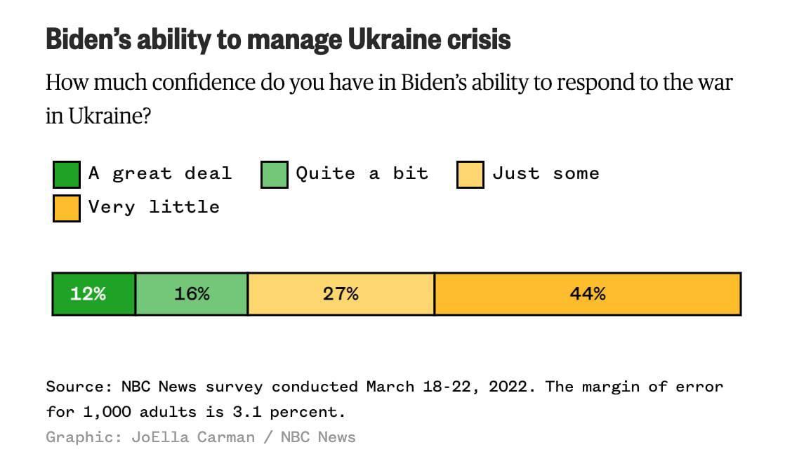 28 % respondentů uvedlo, že Bidenově schopnosti reagovat na válku na Ukrajině a řešit krizi věří "velmi" (12 %) nebo "docela dost" (16 %).