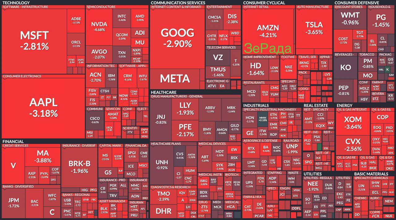 Akcie společností Boeing, Salesforce a Chevron klesly o více než 7 %, 4,5 %, resp. 4 %, a táhly tak Dow dolů. Poražené technologické akcie rovněž utrpěly ztrátu: Netflix a Nvidia klesly o 5 %, zatímco Nasdaq se dotkl nového 52týdenního minima. Pouze čtyři akcie indexu S&P 500 se obchodovaly v zelených číslech.