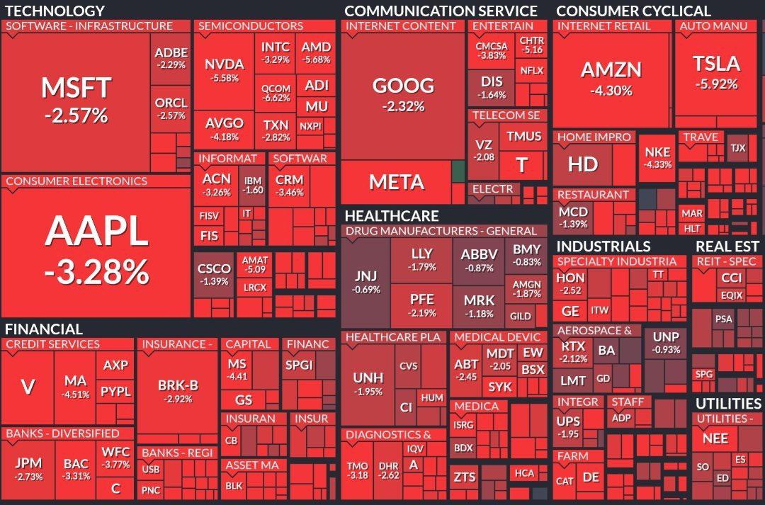 Americký trh pokračuje v poklesu na 3 % v obavách, že agresivnější přístup Fedu k inflaci uvrhne ekonomiku do recese. @banksta