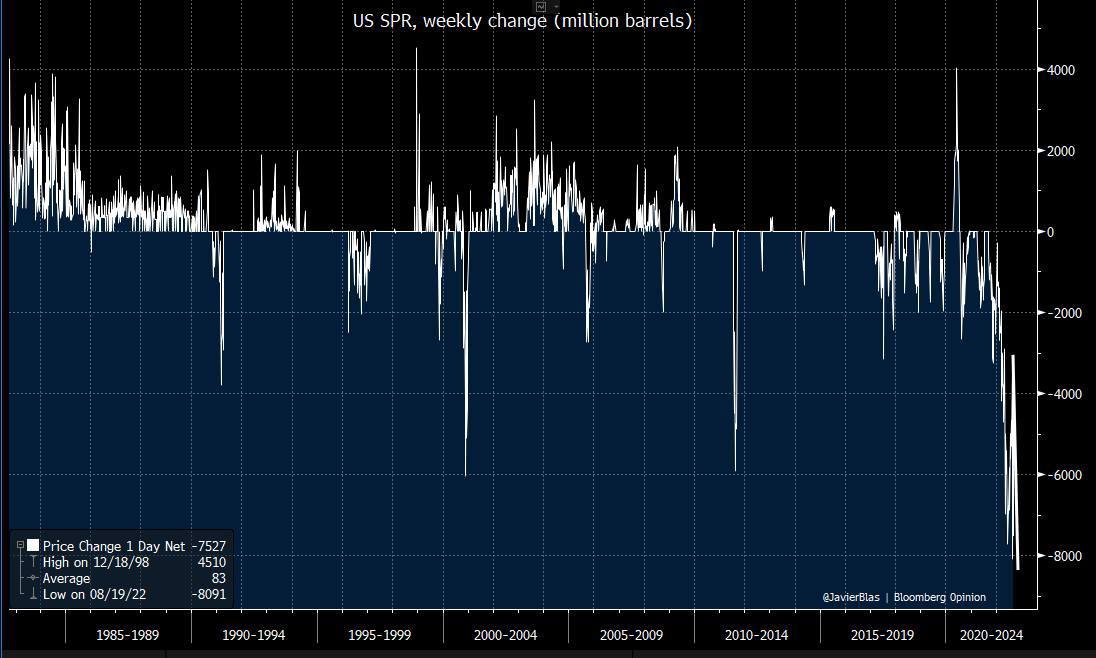 Podle předběžných údajů bylo minulý týden ze strategických rezerv USA uvolněno na trh rekordních 8,4 milionu barelů (1,2 milionu barelů denně) ropy. Zásoby ropy se tak vrátily na úroveň z října 1984.