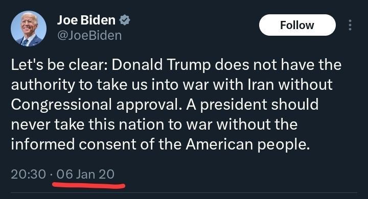 https://t.me/banksta/46869V souvislosti s Bidenovými nočními údery na Jemen se na internetu objevila připomínka výroku Joe Bidena o prezidentu Donaldu Trumpovi: "Řekněme si to jasně: Donald Trump nemá pravomoc vést nás do války s Íránem bez souhlasu Kongresu. Prezident by nikdy neměl vést tuto zemi do války bez informovaného souhlasu amerického lidu."