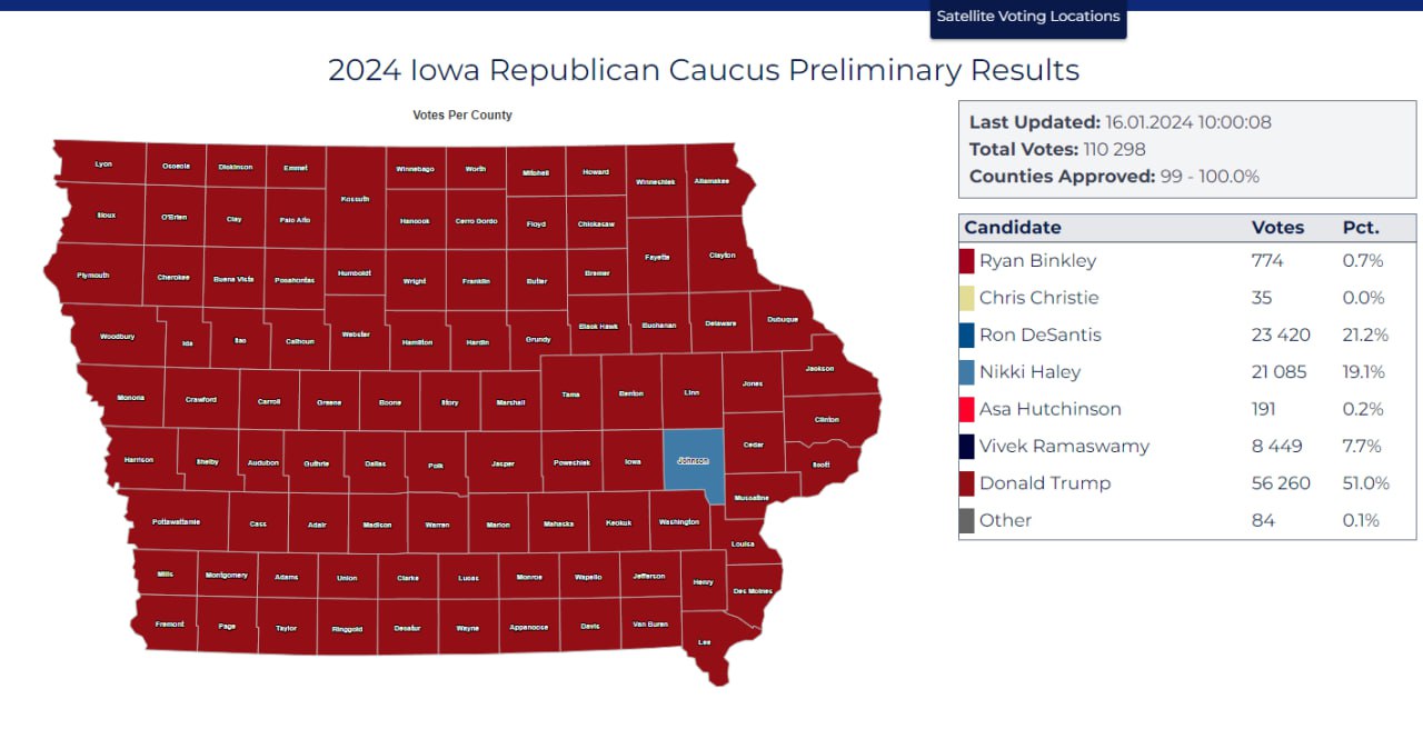 Sedmasedmdesátiletý bývalý prezident Trump byl jasným favoritem hlasování v Iowě a od počátku jeho pozici potvrzovaly i odhady výsledků. Jeho dominantní postavení tak proměnila hlasování v Iowě v soupeření o druhé místo, které pro sebe nakonec získal DeSantis, který pokořil 20procentní hranici.