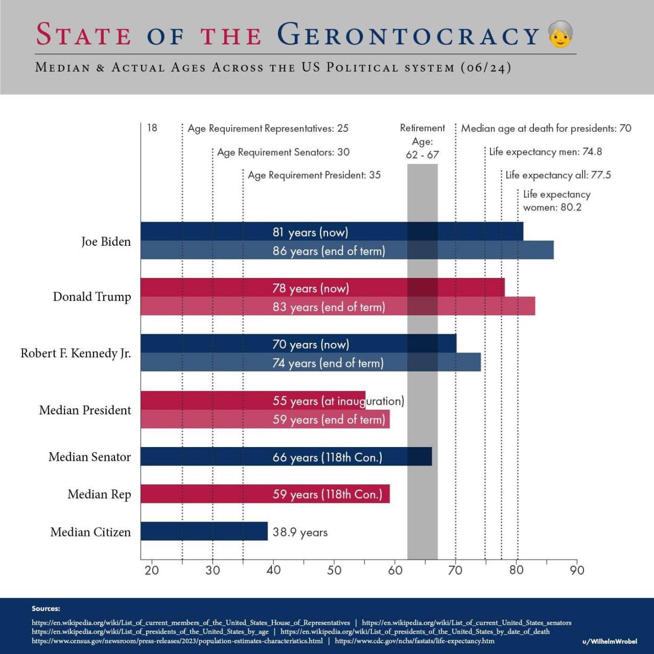 https://x.com/Mayhem4Markets/status/1807605687507148945Střední věk Američana je 38,9. Střední věk našich prezidentů je 55 let při jejich inauguraci. Ale Joe Bidenovi je 81 a Donaldu Trumpovi 78. I RFK je starý. Proč nemůžeme mít kandidáty, kteří se dožijí dopadů svých politik?