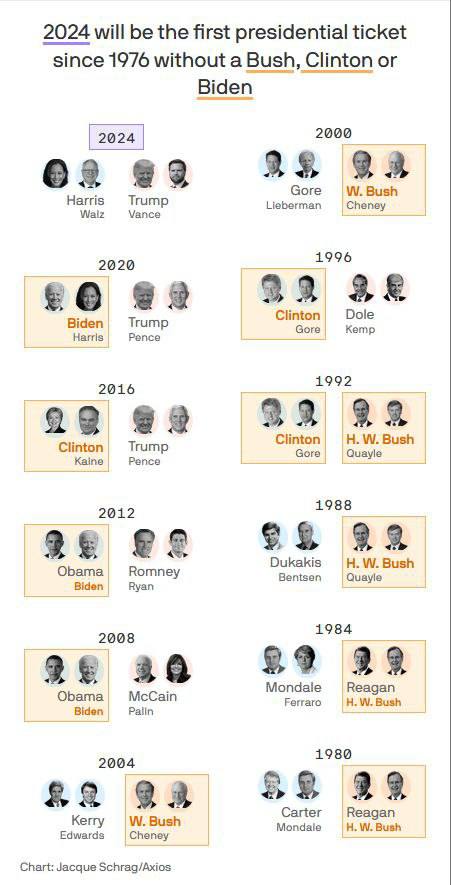 Poprvé od roku 1976 se v prezidentských volbách v USA neobjevili zástupci dynastií Bushů, Clintonů a Bidenů.