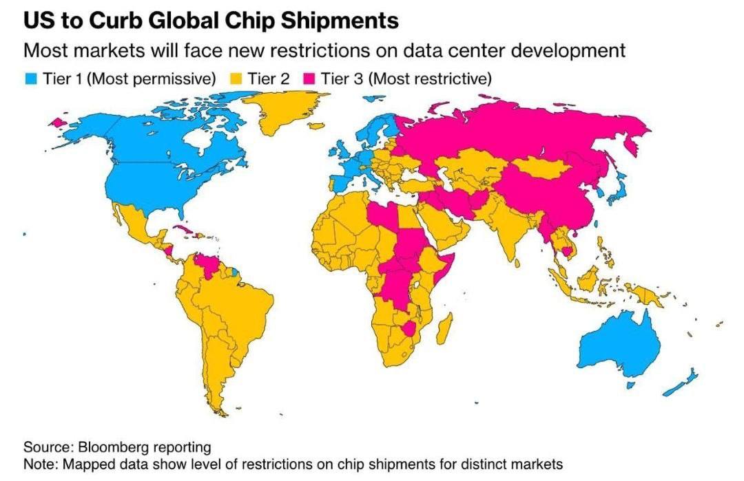 Dovoz čipů bude povolen pouze modrým zemím, oranžovým zemím bude povolen dovoz pouze některých typů čipů a červeným zemím nebude povolen dovoz čipů vůbec.