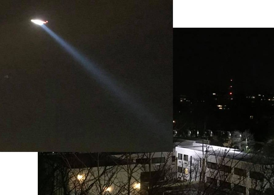 Diplomaté přidali k této zprávě smajlíka v podobě létajícího talíře a také fotografie vrtulníku a budovy osvětlené jeho světlometem.