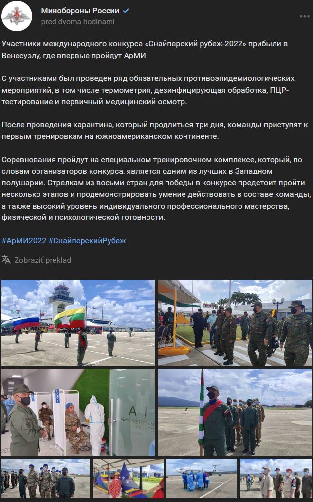Účastníci medzinárodnej súťaže "Snajperskij rubež-2022" (Снайперский рубеж-2022) pricestovali do Venezuely, kde sa po prvýkrát uskutočnia Medzinárodné Armádne Hry. U účastníkov sa vykonalo niekoľko povinných protiepidemiologických opatrení vrátane termometrie, dezinfekcie, PCR testov a vstupného lekárskeho vyšetrenia. Po skončení karantény, ktorá potrvá 3 dni, začnú tímy svoje prvé tréningy na juhoamerickom kontinente.