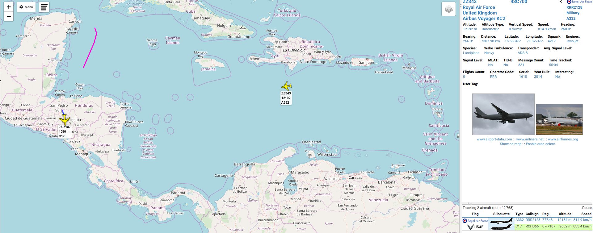 a multifunkční tanker britského letectva Airbus KC2 Voyager (A330-243MRTT) ZZ343 směřuje nad Karibské moře z Evropy (kde chytá zajímavý vektor) - často poslední měsíc pendluje VB <> Akrotiri a Al Minhad Air Base.