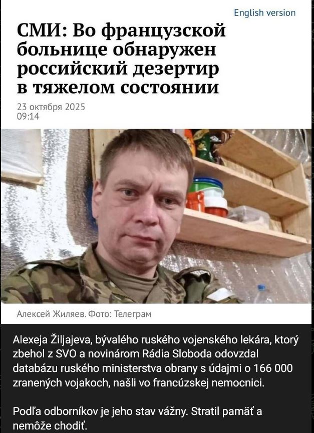 Zdroj https://t.me/casusbellilive/231953, originál https://t.me/yurasumy/25253 / https://t.me/drugoeeto/30194 z 26.10.2025Alexeja Žiljajeva, bývalého ruského vojenského lekára, ktorý zbehol z ŠVO a novinárom Rádia Sloboda odovzdal databázu ruského ministerstva obrany s údajmi o 166 000 zranených vojakoch, našli vo francúzskej nemocnici.