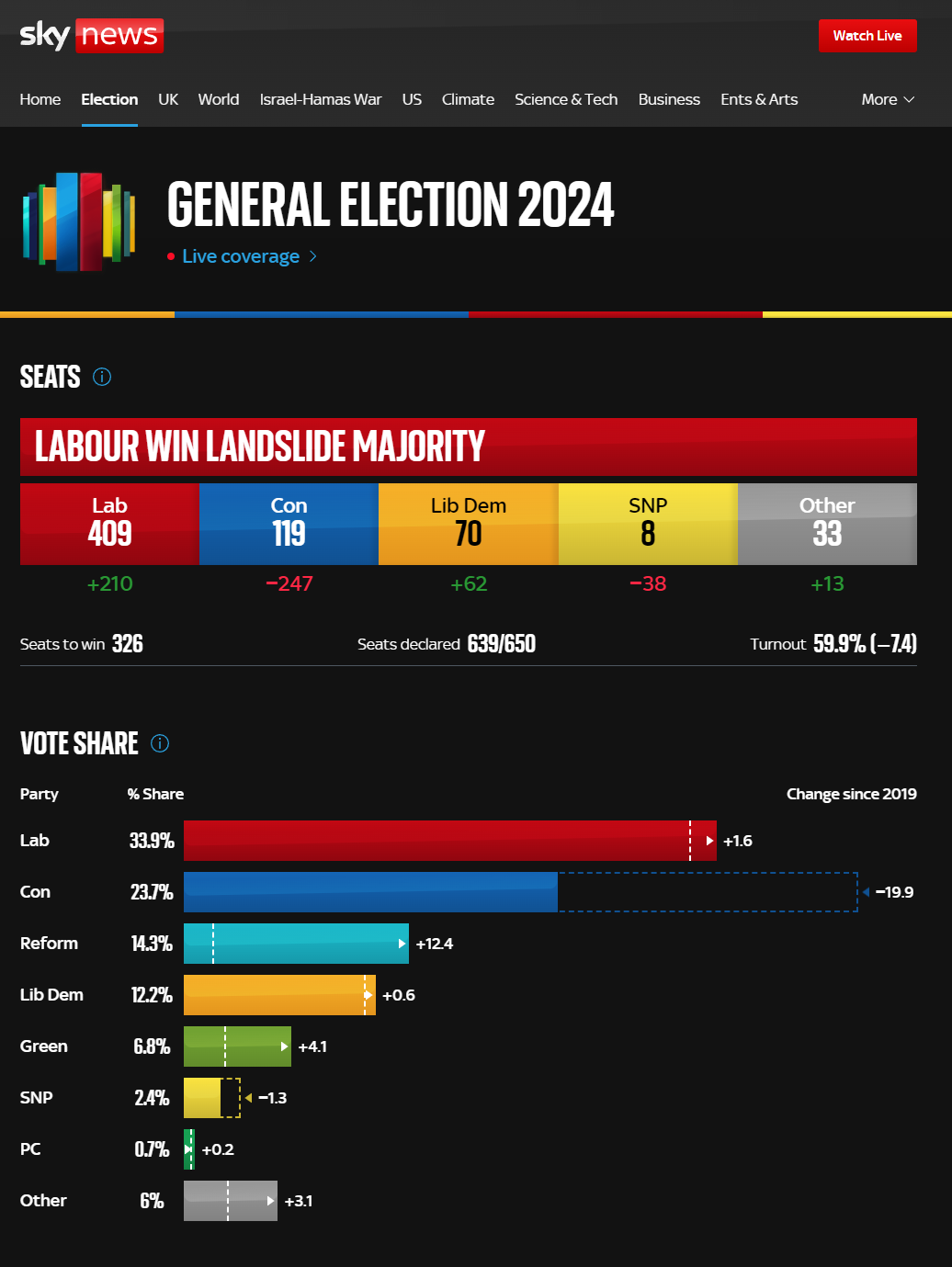 Parlamentní volby v Británii podle odhadů zveřejněných ve čtvrtek večer po uzavření volebních místností vyhráli středoleví labouristé. Vládní konzervativci premiéra Rishiho Sunaka utrpěli porážku a s výraznou ztrátou na vítěze skončí na druhém místě. Příštím premiérem tak bude nynější lídr opozice a někdejší prokurátor a obhájce lidských práv Keir Starmer.