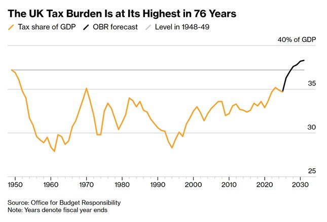 38 % HDP – daňové zatížení ve Velké Británii podle nového rozpočtu ministryně financí Rachel Reevesové. Jedná se o nejvyšší hodnotu od konce druhé světové války, uvádí Bloomberg (https://www.bloomberg.com/news/articles ... n-obr-says).
