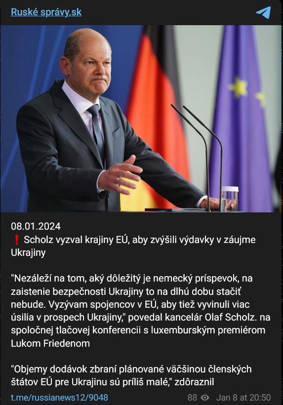 "Nezáleží na tom, aký dôležitý je nemecký príspevok, na zaistenie bezpečnosti Ukrajiny to na dlhú dobu stačiť nebude. Vyzývam spojencov v EÚ, aby tiež vyvinuli viac úsilia v prospech Ukrajiny," povedal kancelár Olaf Scholz. na spoločnej tlačovej konferencii s luxemburským premiérom Lukom Friedenom