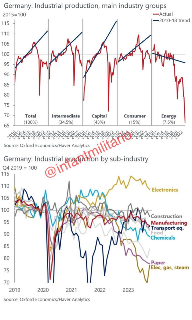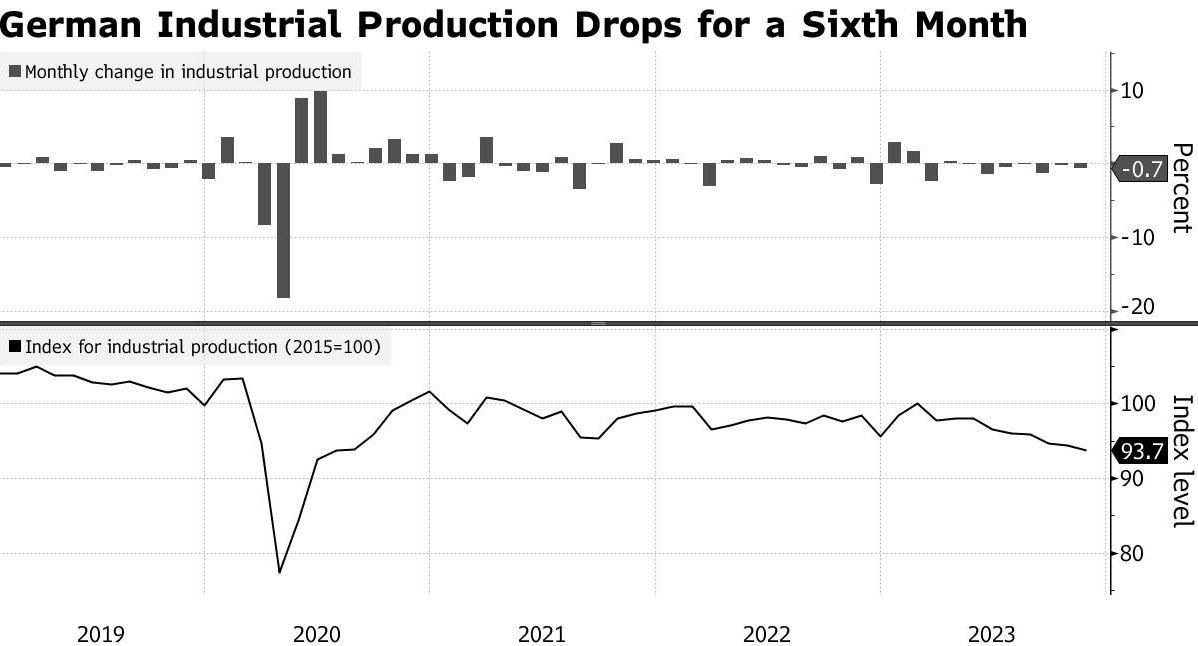 Německá průmyslová výroba v listopadu nečekaně klesla o 0,7 %, což je již šestý pokles v řadě, a překvapila ekonomy, kteří předpovídali růst o 0,3 %. Německo pravděpodobně ukončí rok 2023 první recesí od pandemie. @banksta