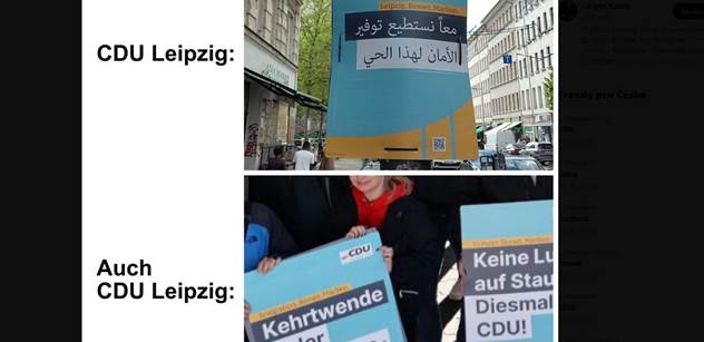 Německá CDU se v Lipsku postarala o poprask. Před komunálními volbami, které proběhnou souběžně s volbami do Evropského parlamentu se pravicová strana rozhodla oslovit arabsky a turecky mluvící voliče. V jedné ze čtvrtí slibuje, že se zde zasadí o větší bezpečnost a pořádek. Na čtyřech stovkách plakátů. „A po jediné noci bylo vše strženo a ukradeno!“ napsal server nejčtenějšího německého listu Bild.