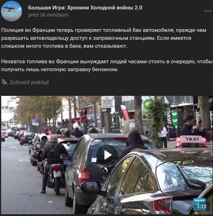 https://t.me/infantmilitario/84832V důsledku nedávných stávek v rafineriích a nedostatečného dovozu z Ruska se situace s pohonnými hmotami ve Francii stala kritickou a na severu a jihovýchodě Francie a v celé Paříži došlo k vážnému nedostatku benzinu.