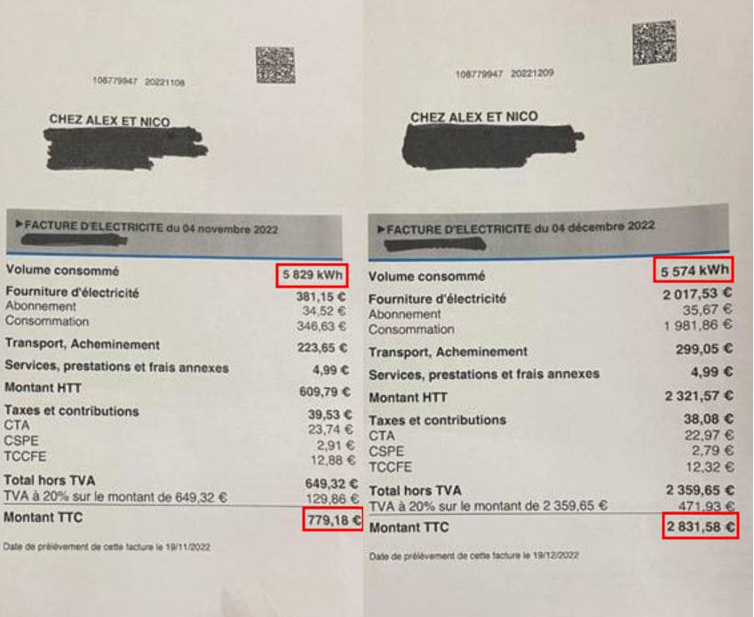 Účty za elektřinu malé francouzské pekárny za říjen a listopad