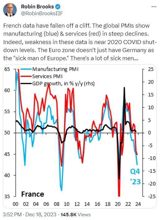 "Francouzská ekonomika se propadla z útesu. Indexy podnikatelské aktivity ve zpracovatelském průmyslu (modrá čára) a službách (červená) ve čtvrtém čtvrtletí letošního roku prudce klesají. Již nyní se blíží svým úrovním z roku 2020, kdy země seděla na kovidové uzávěrce. Nejen Německo je tedy "nemocným mužem Evropy". V eurozóně je jich hodně..."