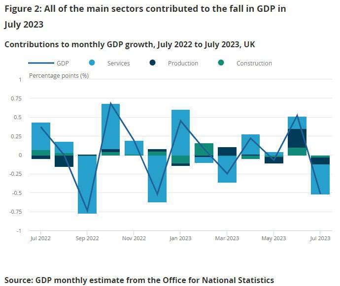Ekonomika Spojeného království se v červenci snížila o 0,5 %, což je více, než se očekávalo.