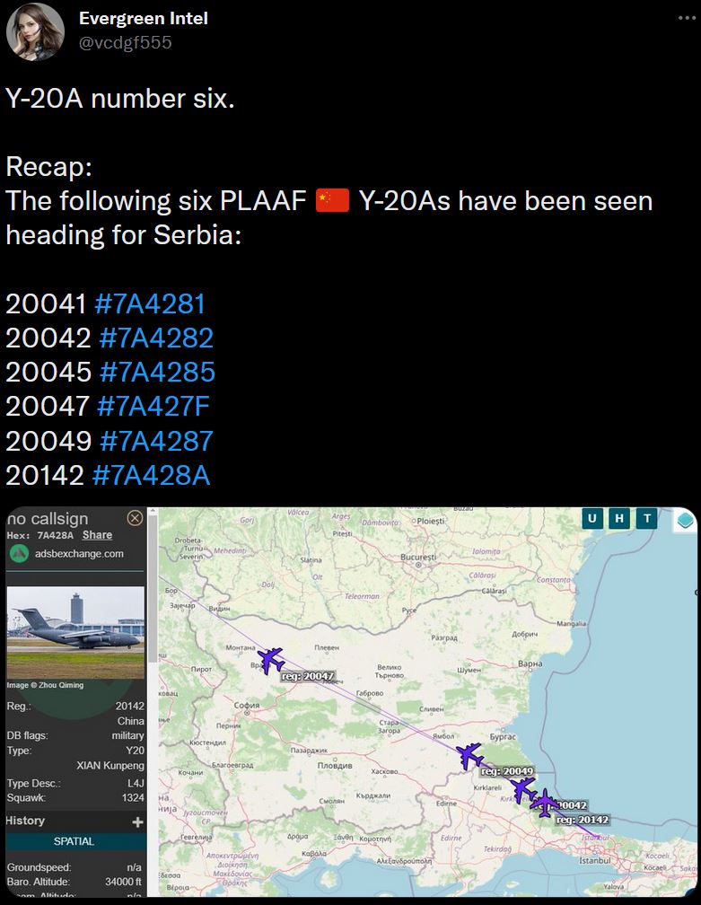 Na leteckej základni srbských vzdušných pristálo 6 čínskych vojenských dopravných lietadiel Xian Y-20. Uvádza sa, že do Srbska bola dodaná prvá várka čínskych protilietadlových raketových systémov FK-3 (exportná verzia HQ-22), ktoré vyrába čínska spoločnosť CASIC (Aerospace Science and Industry Corporation). FK-3 má tieto charakteristiky zóny zásahu: minimálny dosah 5 km, maximálny dosah 100 km, minimálna výška 50 m a maximálna výška 27 km. Každý protilietadlový raketový systém FK-3 je vybavený 3 odpaľovacími vozidlami so 4 prepravnými a odpaľovacími kontajnermi na každom z nich a je schopný vystreliť 12 protilietadlových riadených rakiet proti 6 cieľom súčasne. Navádzacia hlavica strely má poloaktívny radar.