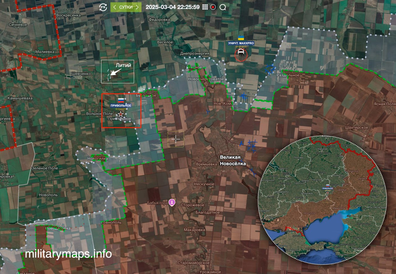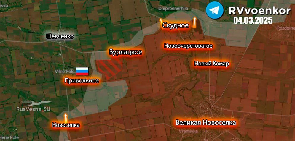 ⭐️ Dňa 4. marca 2025 oslobodili obec Privolnoje jednotky 394. gardového motostreleckého pluku 127. motostreleckého pluku 5. armády skupiny „Vostok“ ⇢ https://t.me/voin_dv/13721 [bez vizuálneho potvrdenia].