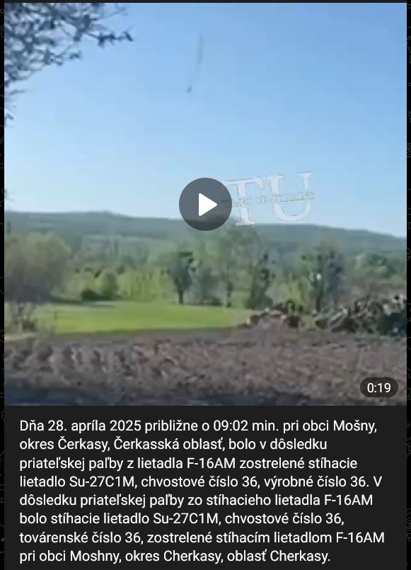 V pondelok 28.04.2025 približne o 09:02 hod. pri obci Mošny (Мошны), Čerkasskogo rajóna, Čerkasská oblasť, bolo v dôsledku priateľskej paľby z lietadla F-16AM zostrelené stíhacie lietadlo Su-27S1M (Су-27С1М), chvostové číslo 36, továrenské číslo 36911019614 z 39. brigády taktického letectva VS VSU (letisko Ozernoje (Озерное), Žitomírska oblasť). Kapitán Nikolaj Nikolajevič Klubnikin (Клубникин Николай Николаевич), absolvent Charkovského inštitútu pilotov v roku 2020, sa úspešne katapultoval.