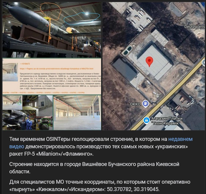 Zdroj https://vk.com/wall-123538639_4673870 z 22.08.2025Medzitým OSINT-eri lokalizovali budovu, v ktorej bolo na nedávnom videu ukázaná výroba / montáž tých najnovších „ukrajinských“ rakiet FP-5 „Milanion“/„Flamingo“.