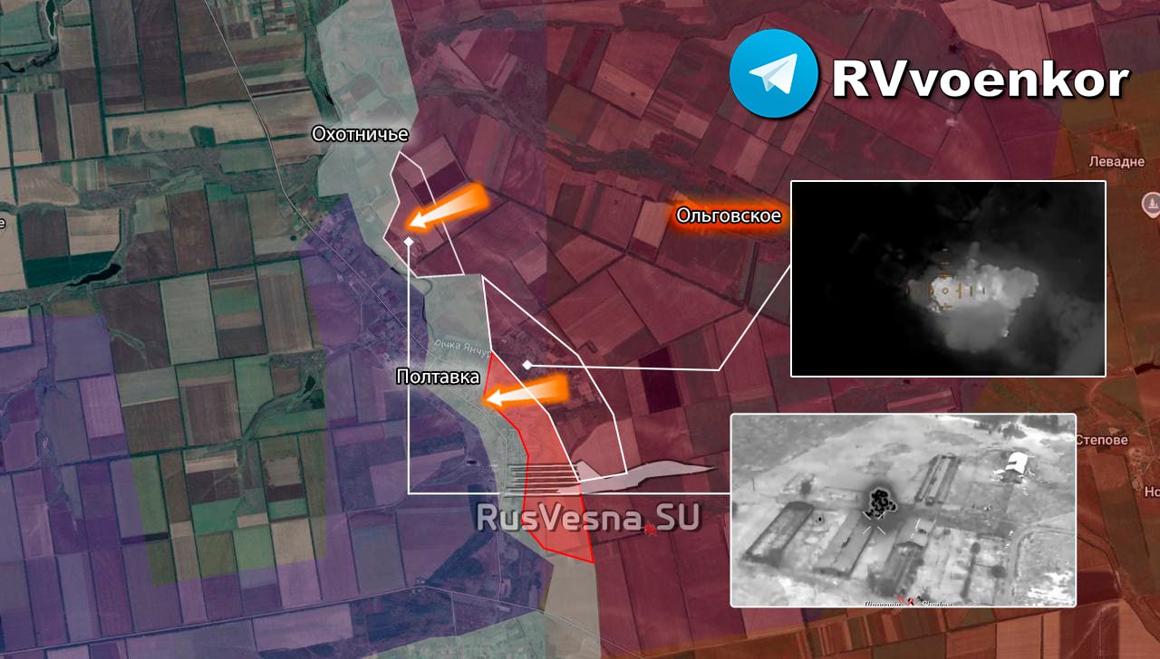 ▪️Na veľkomcihajlovskom smere po oslobodení Verbového a Stepového ruské vojská najprv prerazili k hangárom v Aleksejevke, potom vstúpili a obsadili značnú časť zástavby, kde sa upevnili na nových pozíciách.
