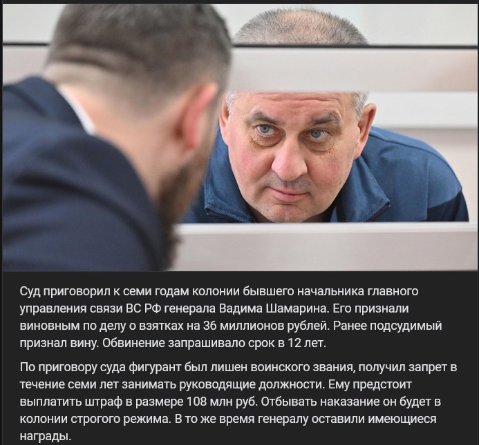 Zdroj https://vk.com/wall-123538639_4547630 z 17.04.2025Súd odsúdil na 7 rokov väzenia bývalého náčelníka hlavného komunikačného oddelenia VS RF generála Vadima Šamarina (Вадима Шамарина). Bol uznaný vinným v prípade úplatkov v hodnote 36 miliónov rubľov. Predtým sa obžalovaný k vine priznal. Prokuratúra žiadala trest vo výške 12 rokov. Na základe rozsudku súdu bola obžalovanému odňatá vojenská hodnosť, zákaz zastávať riadiace funkcie na 7 rokov. Bude musieť zaplatiť pokutu vo výške 108 miliónov rubľov. Trest si odpyká v kolónii s prísnym režimom. Zároveň boli generálovi ponechané doterajšie vyznamenania.