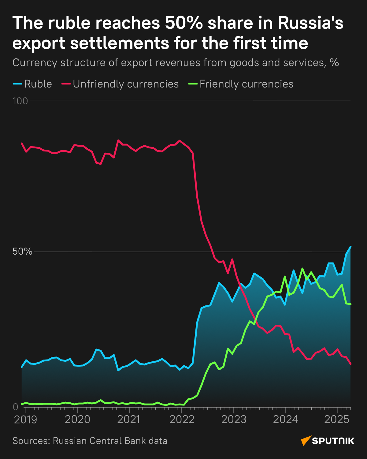 Podľa údajov ruskej centrálnej banky podiel rubľa na dovozných platbách z Ázie v apríli prvýkrát prekročil 50 % a dosiahol 51,9 %, čo je medziročný nárast o 15,6 percentuálneho bodu.