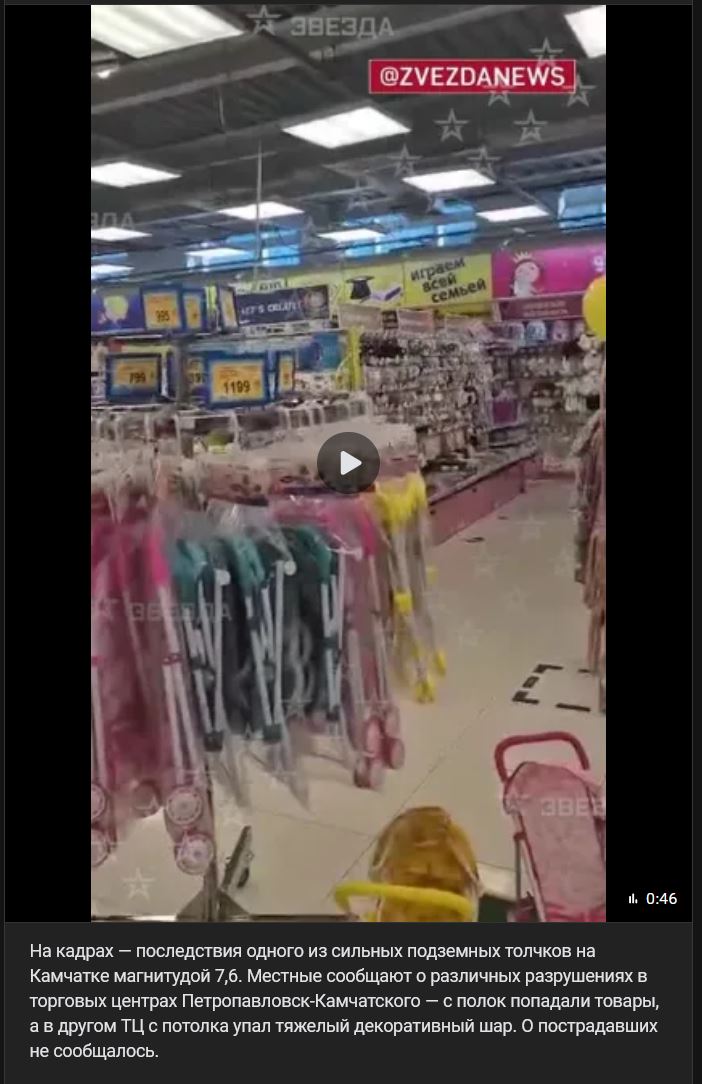 Zábery ukazujú následky jedného zo silných otrasov zeme na Kamčatke s magnitúdou 7,6. Miestni obyvatelia hlásili rôzne škody v nákupných centrách v Petropavlovsku-Kamčatskom (Петропавловск-Камчатского) - z regálov spadol tovar a v inom nákupnom centre spadla zo stropu ťažká ozdobná guľa. Neboli hlásené žiadne obete.