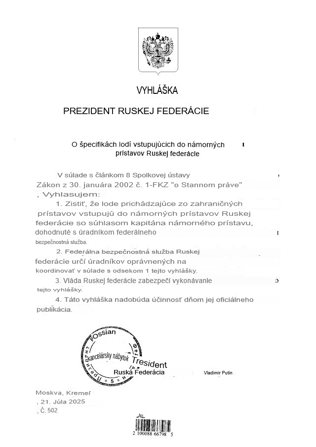 Putin prezidentským dekrétom zakázal cudzozemným lodiam vstupovať do ruských prístavov bez povolenia FSB.