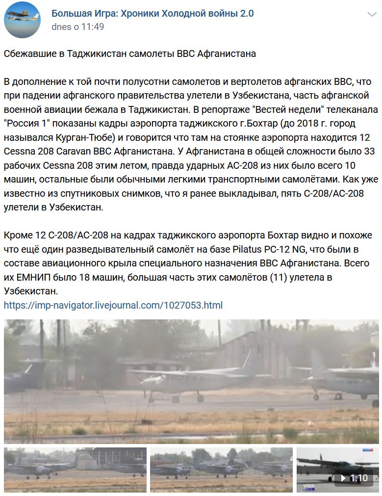 Okrem takmer 50-tich lietadiel a vrtuľníkov afganského letectva, ktoré po páde afganskej vlády ušli do Uzbekistanu, niektoré afganské vojenské lietadlá ušli do Tadžikistanu. V TV reportáži sa objavujú zábery z letiska v tadžickom meste Bochtar / Бохтар (do roku 2018 sa nazývalo Kurgan-Tjube / Курган-Тюбе, cca 60 km od hranice) a uvádza sa, že na letisku sa nachádza 12 lietadiel Cessna 208 Caravan afganských vzdušných síl. Afganistan mal toto leto k dispozícii celkovo 33 funkčných lietadiel Cessna 208, hoci len 10 z nich boli útočné lietadlá AC-208, zvyšok boli bežné ľahké dopravné lietadlá. Ako už vieme zo satelitných snímok, do Uzbekistanu letelo 5 lietadiel C-208/AC-208.