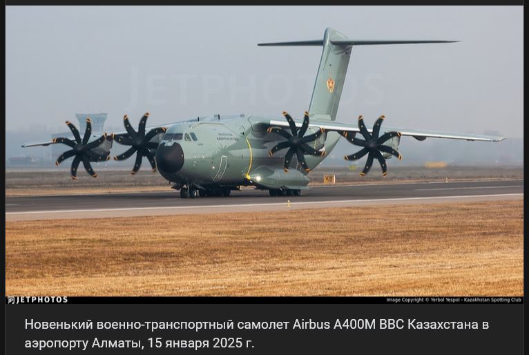 Najnovšie vojenské dopravné lietadlo Airbus A400M VVS Kazachstanu na letisku Almaty, 15.01.2025.