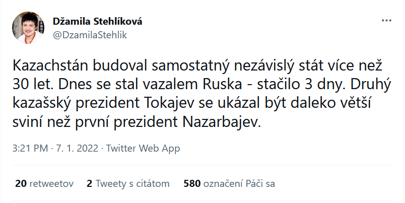 Vyjádřil mimořádné znepokojení nad tím, co se děje v Kazachstánu, kde "lidé strádají" a velká města jsou v plamenech.