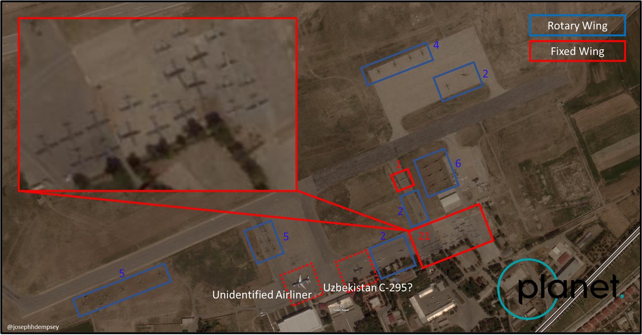 Satelitné foto z pondelka 16.08.2021 na letisko Termuz v Uzbekistane kde pristávali lietadlá z Afganistanu: