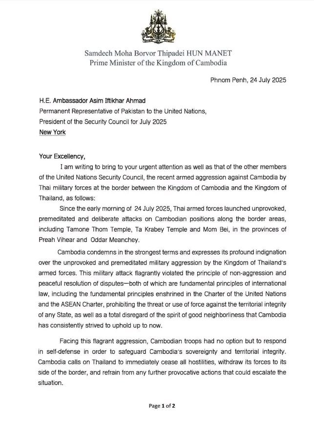 Kambodža požiadala Pakistan (predsedu Bezpečnostnej rady OSN) o zvolanie mimoriadneho zasadnutia BR OSN po tom, ako Thajsko podniklo odvetný útok na Kambodžu, ktorý považuje za "nevyprovokovaný, premyslený a úmyselný" útok zo strany Thajska