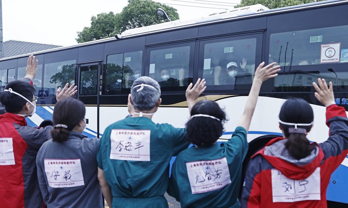Šanghaj uzavírá polovinu provizorních nemocnic na úrovni měst, ale varuje před epidemickými vlnami v některých starých čtvrtích Členové lékařského týmu mávají propuštěným pacientům v nemocnici Tongji v Šanghaji, 13. května 2022. Poslední várka 172 pacientů propuštěných z provizorní nemocnice v okrese Jinshan v Šanghaji se toho dne zotavila.