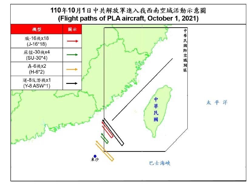 25 PLA aircraft (J-16*18, SU-30*4, H-6*2 and Y-8 ASW) entered #Taiwan’s southwest ADIZ on October 1, 2021. Please check our official website for more information: https://t.co/C7012S8hSo pic.twitter.com/HoalLl3Ewx