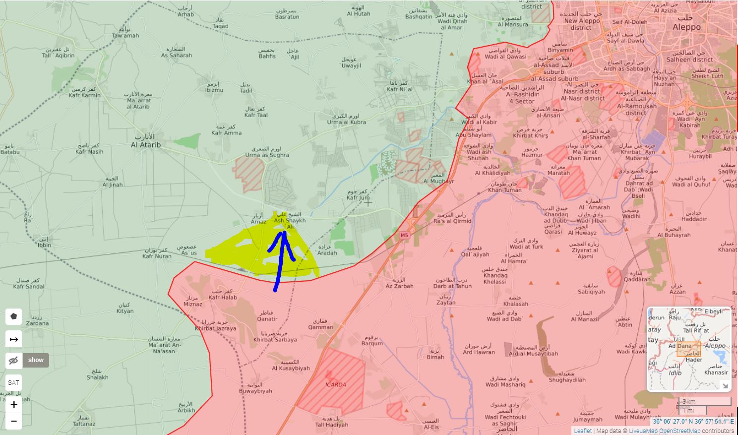 Sýrská armáda reagovala na ostřelování tureckou okupační armádou v oblasti Atarib. Podle zdroje bylo zabito 18 členů Al-Kajdy. Ve spojení s tureckým dělostřelectvem v západní oblasti Aleppa zaútočil sebevražedný atentátník Tahrir al-Sham (HTS) na SAA v Sheikh Ali, severovýchodně od Kafr Halab.