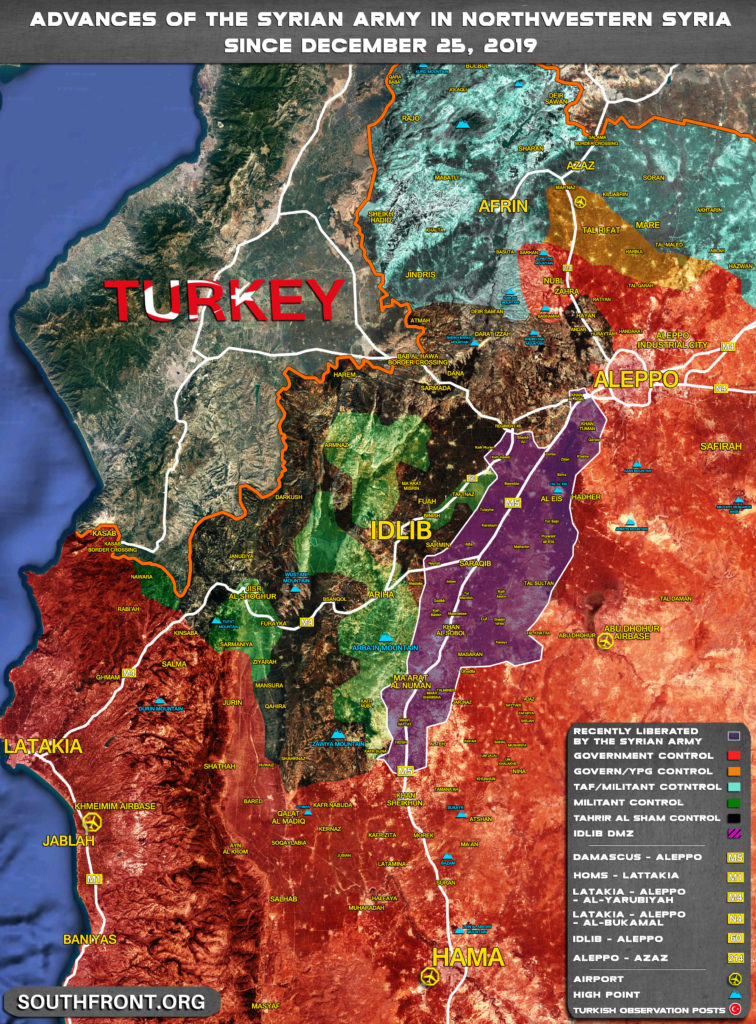 Od 25. decembra 2019 sýrska armáda a jej spojenci oslobodili viac ako 2 000 km2 od Hayat Tahrir al-Šam a ďalších radikálnych militantných skupín v provinciách Idlib a Aleppo. Jedným z kľúčových úspechov tohto postupu je , že vládne sily zabezpečili diaľnicu M5, ktorá vedie od jordánskych hraníc do mesta Aleppo.
