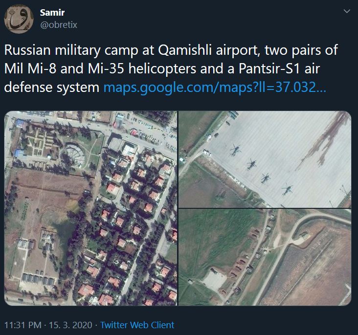Podľa satelitných foto sa na letisku Qamishlo International Airport nachádzajú 2 ks transportných vrtuľníkov rodiny Mil Mi-8 + 2 ks bojových vrtuľníkov rodiny Mil Mi-35 + PVO systém Pantsir-S1