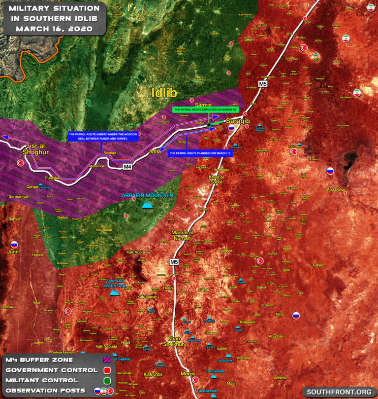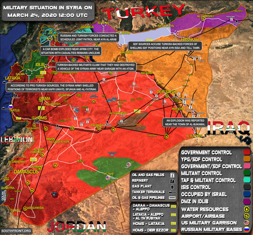 Turecké a ruské sily 23. marca uskutočnili druhú „obmedzenú“ spoločnú hliadku v rámci novej dohody o de eskalácii Idlibu, ktorá sa nedávno dosiahla v Moskve. Na hliadke sa údajne zúčastňovalo 6 kusov vojenskej techniky (3 - turecká a 3 - ruská) a konala sa na krátkom úseku diaľnice M4 západne od Sraqibu.
