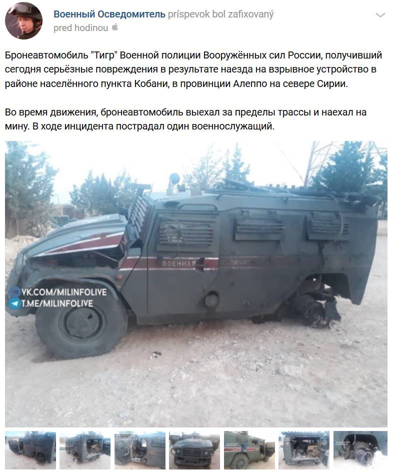 Podle prvních zpráv, IED zasáhlo jedno ruské vozidlo východně od Kobane...