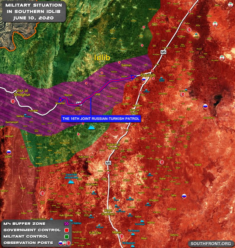 Ruská vojenská polícia a turecká armáda 10. júna uskutočnili 16. spoločnú hliadku na diaľnici M4 v severozápadnom Sýrii v oblasti Veľkého Idlibu.