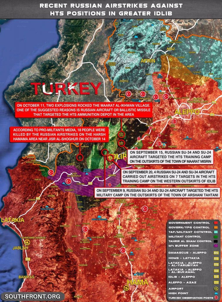 Podľa poľnej správy guvernorátu Idlib ruské letectvo silno zameralo pozície Hay’ata Tahrira Al-Shama spolu s jedným z ich vojenských konvojov, ktoré sa pokúšali dostať k frontovým líniám v Džabal Al-Zawiya.