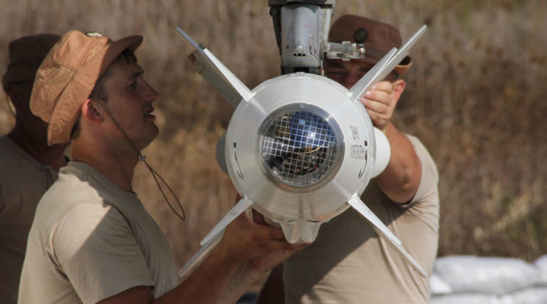 2712070 10.04.2015 Ruskí mechanici pripevňujú vysoko presnú raketu Kh-25 na lietadlo Su-24 na leteckej základni Khmeimim v Sýrii. Dmitrij Vinogradov / RIA Novosti