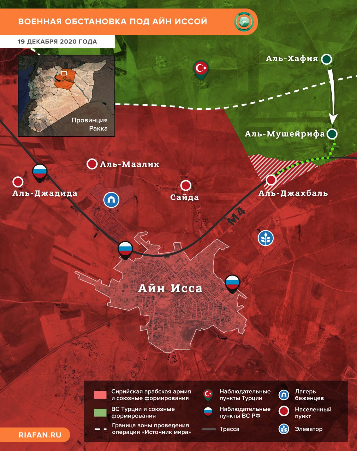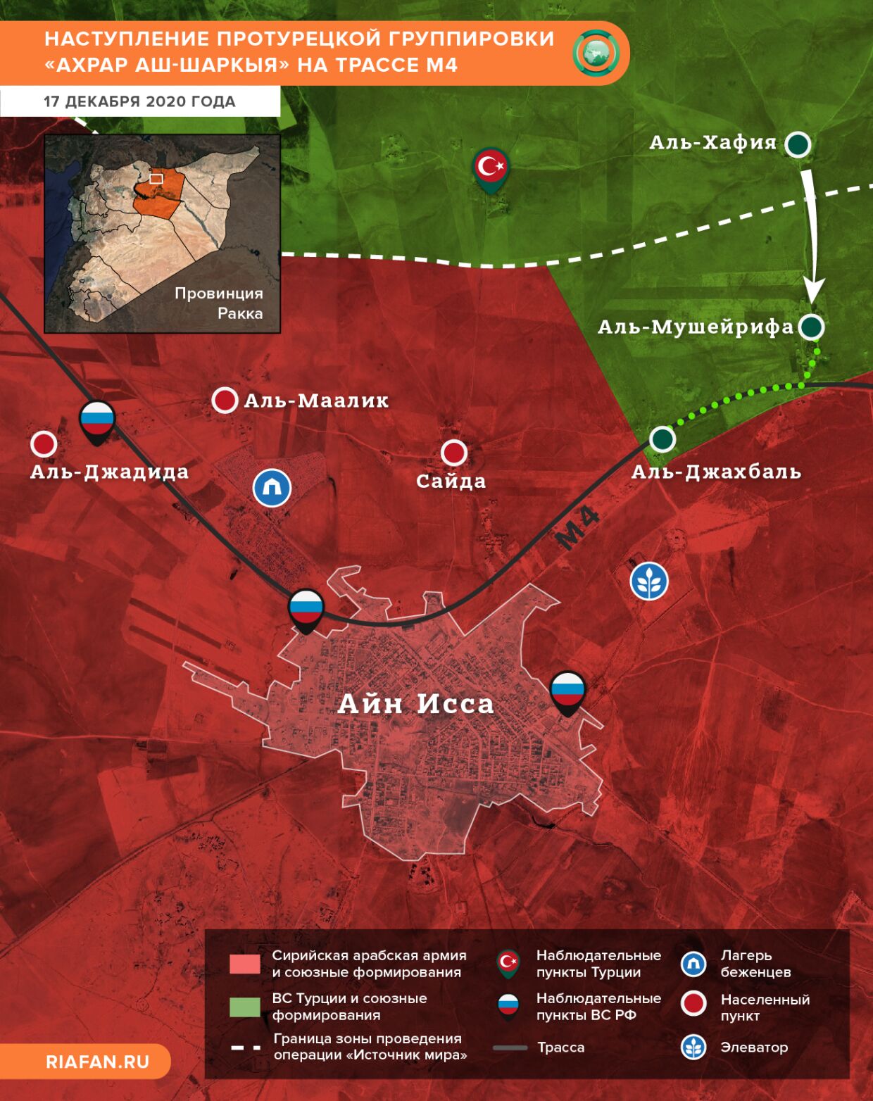 V oblasti osád Al-Jahbal a Al-Musheirifa prebiehajú strety medzi kurdskými militantmi a formáciami „Sýrskej národnej armády“, ktorú ovládajú Turci. Zabavenie týchto osád by mohlo viesť k zastaveniu pohybu pozdĺž strategickej diaľnice M4, ktorá spája západnú a východnú časť Sýrie.